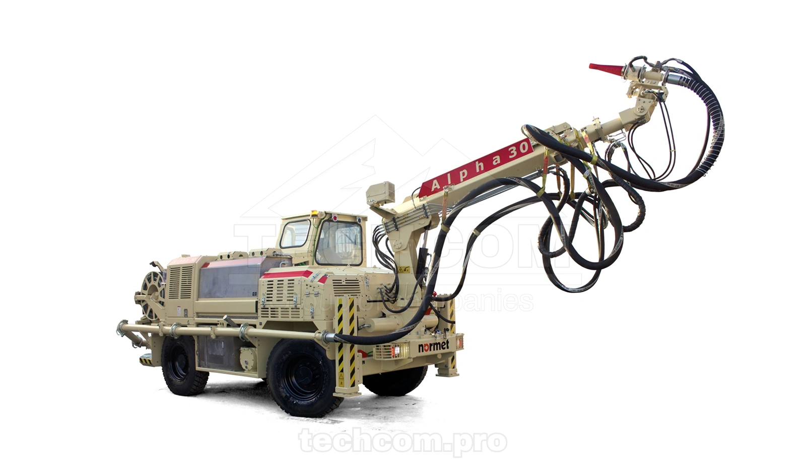 TechCom supplies spare parts for Alpha 30 DC7, including NSP 30 pump components, accelerator dosing systems, hydraulic assemblies, compressor parts, and wear components to ensure reliable underground sprayed concrete operations.